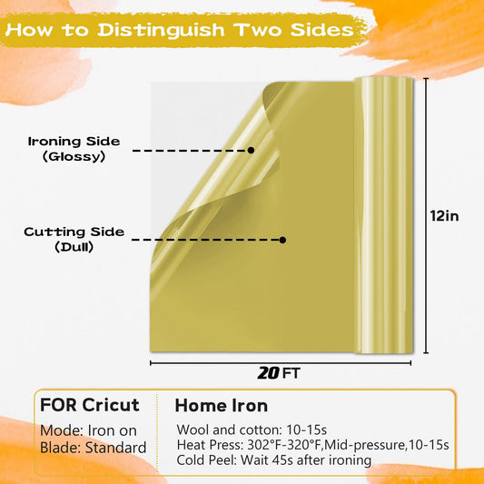 IROHTV Dull Gold Heat Transfer Vinyl, 12'' x 20ft Golden HTV, Iron on Vinyl for Shirts Suitable Fabrics, Heat Press Vinyl for Cricut All Cutter Machine, HTV Vinyl Roll for Heat Vinyl Design
