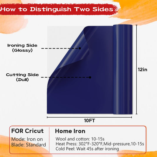 IROHTV Blue HTV Heat Transfer Vinyl, 12'' x 10ft Iron on Vinyl Compatible with Cricut All Cutter Machine, Heat Vinyl Roll for T Shirts, HTV Heat Press Vinyl-Easy to Cut &Weed(Navy Blue)