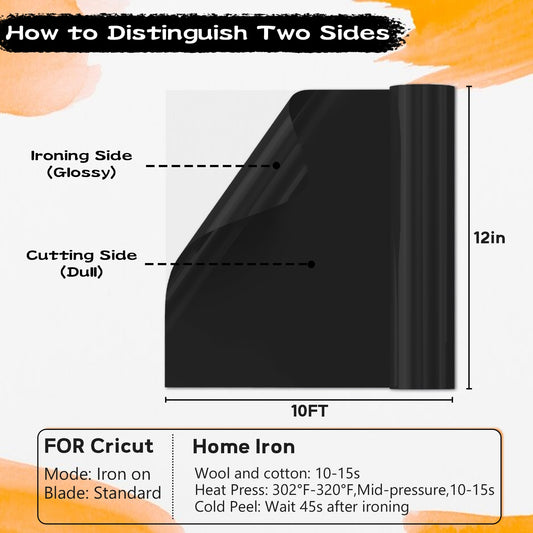 IROHTV Black Heat Transfer Vinyl, 12''x 10ft Black HTV, Iron on Vinyl for Shirts Suitable Fabrics, Heat Press Vinyl for Cricut All Cutter Machine, easy weeding HTV Vinyl Roll for Heat Vinyl Design