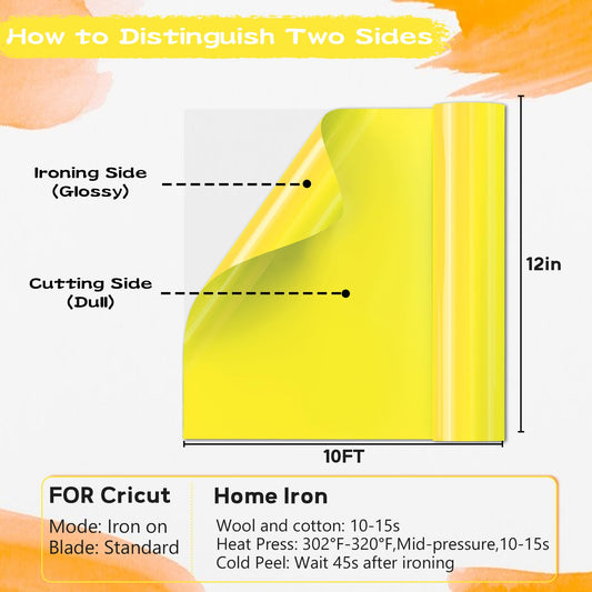 IROHTV Yellow Heat Transfer Vinyl, 12'' x 10ft Yellow HTV, Iron on Vinyl for Shirts Suitable Fabrics, Heat Press Vinyl for Cricut All Cutter Machine, Easy Weeding HTV Vinyl Roll for Heat Vinyl Design